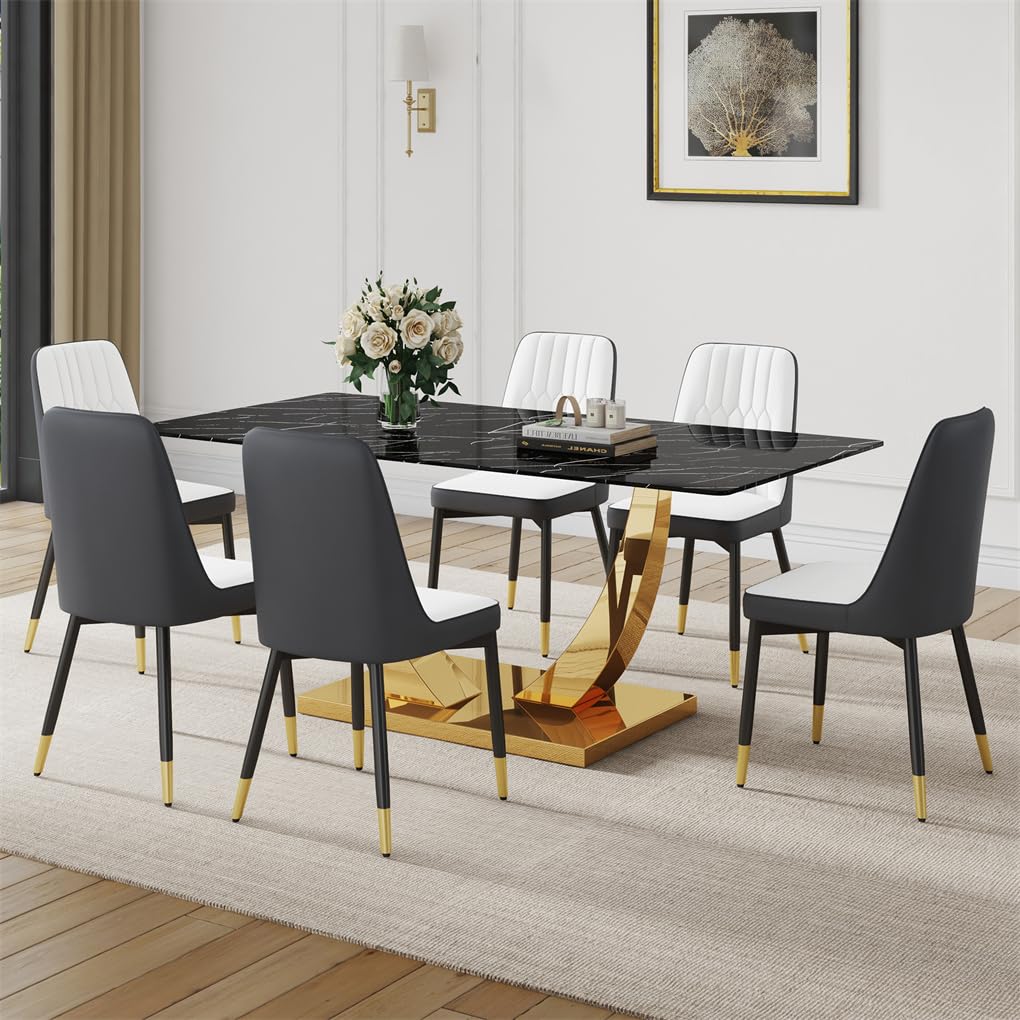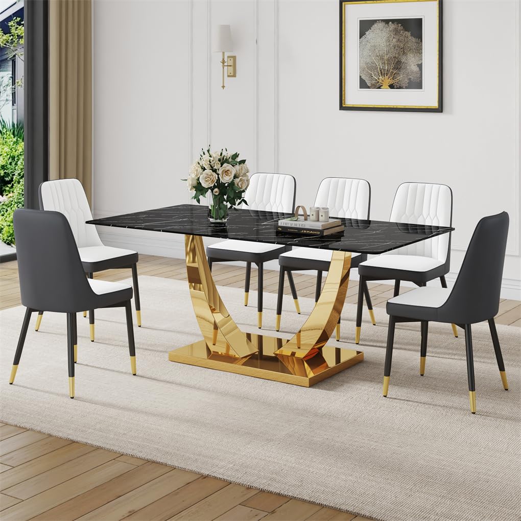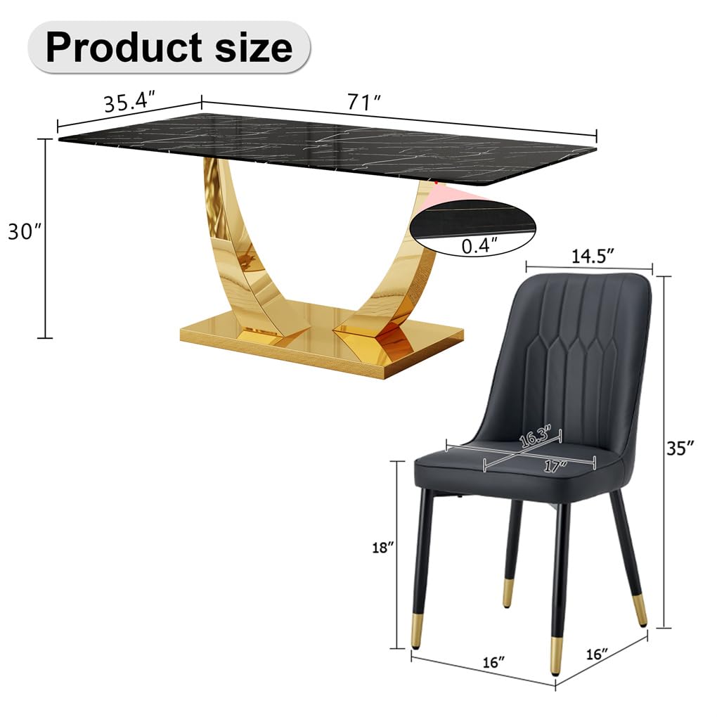 - Black Faux Marble Dining Room Table: 0.4'' Thick Marble Tabletop + Metal U-shaped Leg + Gold Base: The black dining table top made of high quality 0.4'' Thick which was heat resistance and scratching resistance. The table, measuring 71'' x 35.4'' x 30'' (DWH), boasts a substantial weight capacity of 500 lbs. Enhanced stability is ensured through the support of U-shaped leg and table base