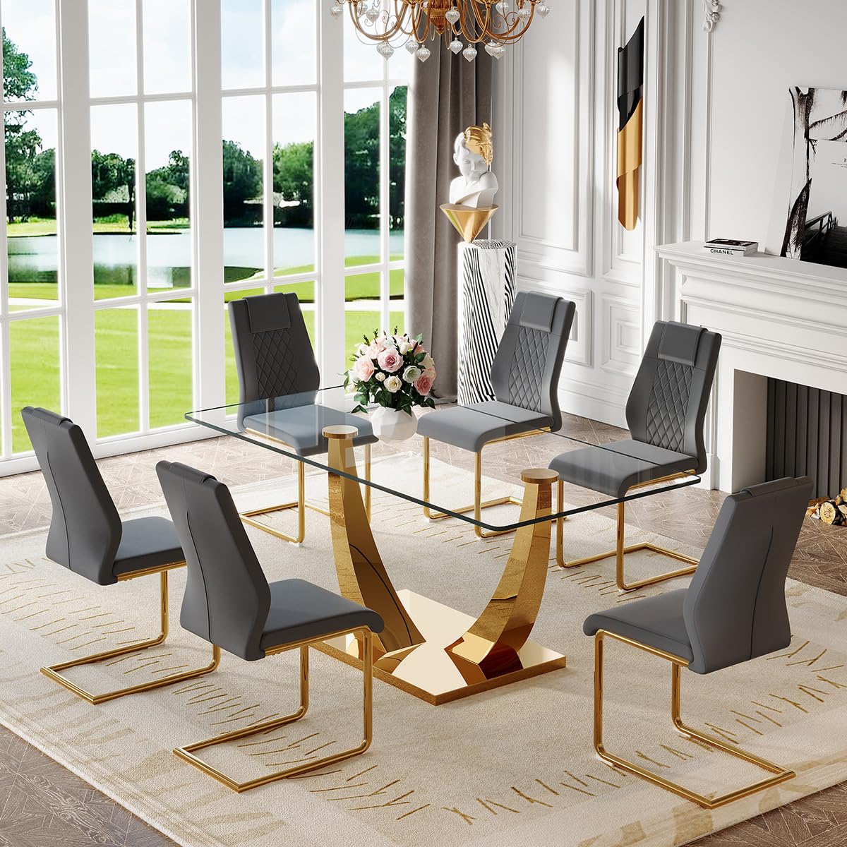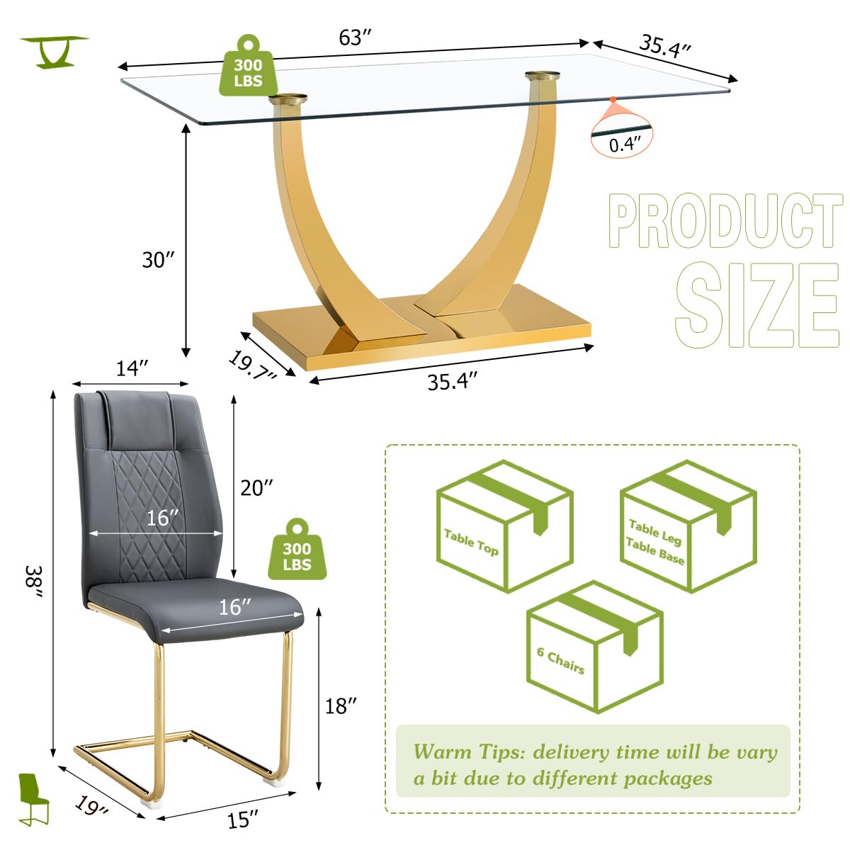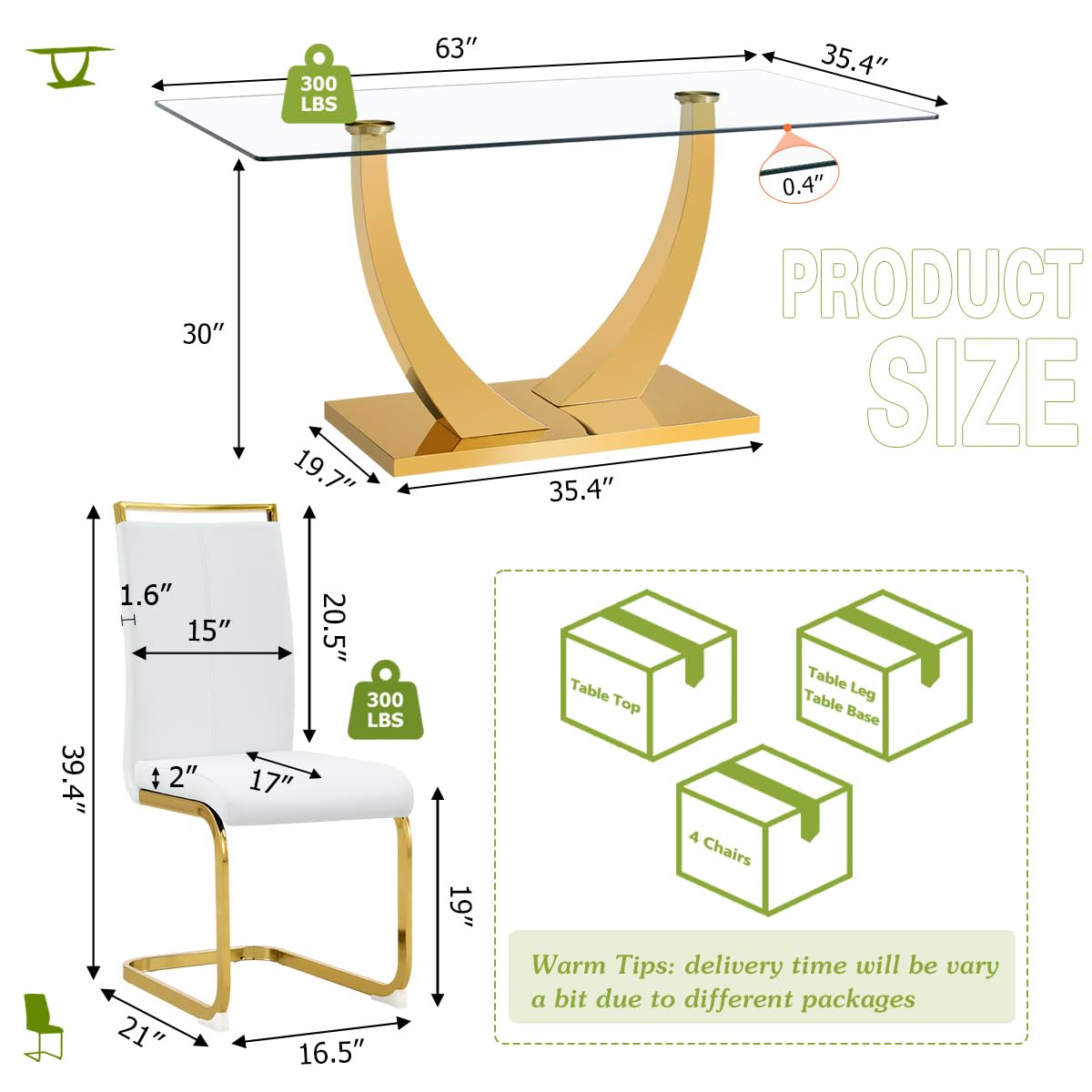 - 63'' Glass Dining Table Set for 4: Our dining set comprises a clear tempered glass table accompanied by 4 PU leather dining chairs. Elevate the overall sense of well-being with this stylish and minimalist ensemble. Designed to comfortably seat four individuals, this kitchen dining table set is an ideal choice for family dinners and gatherings with friends, combining both functionality and aesthetic appeal