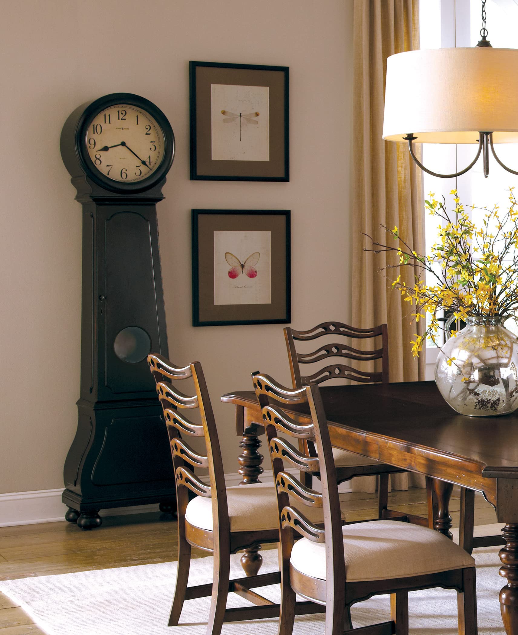 - MORA STYLE DESIGN: Enhance your living space with the Howard Miller Graham Floor Clock II, featuring a stunning Mora style design that brings timeless elegance to any room. The black finish details create a sophisticated aesthetic, while the glass covered cutout showcases the beautiful pendulum, making it a true focal point in your home.