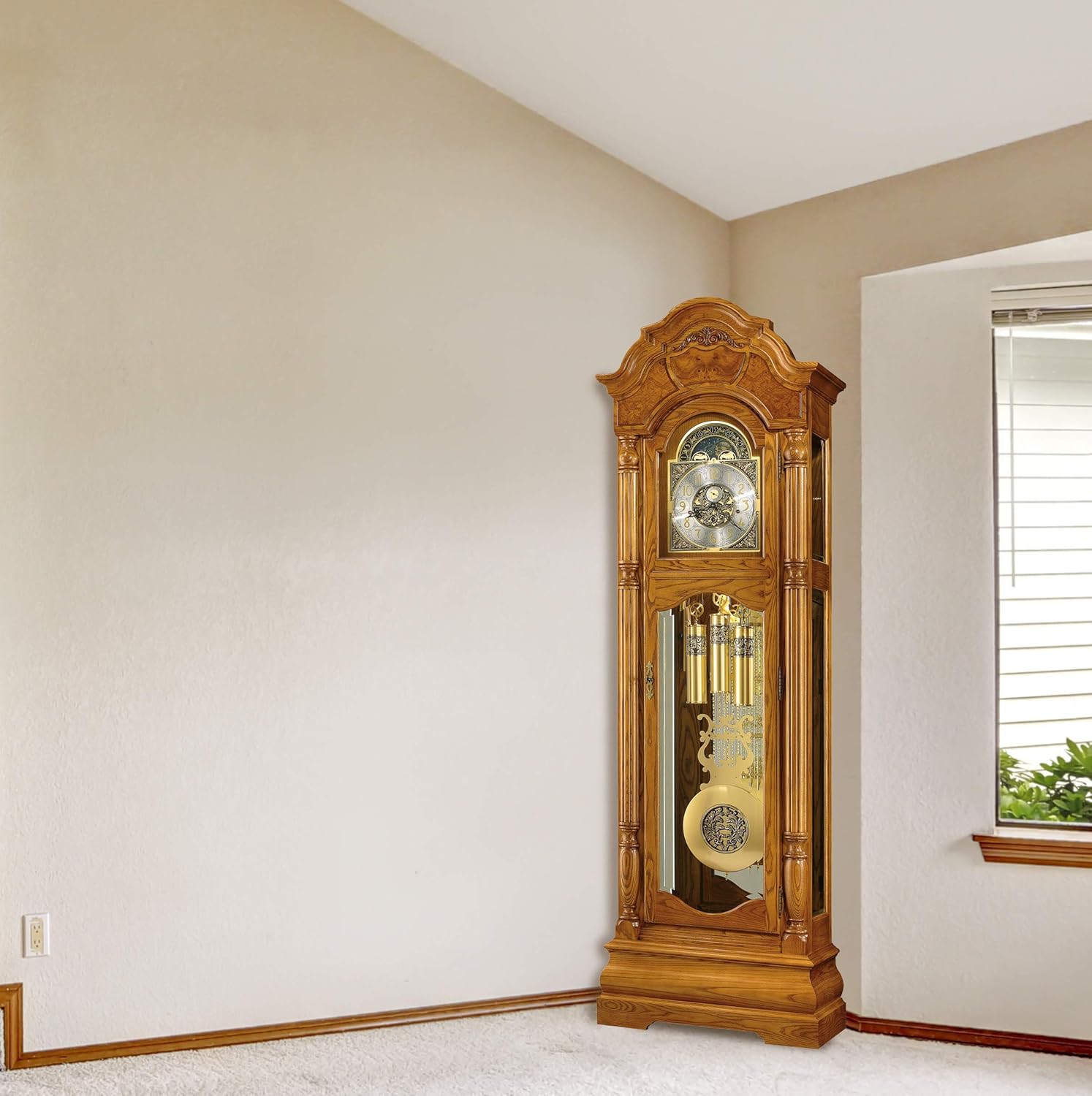- TIMELESS GRACE: The Howard Miller Scarborough floor clock stands as a masterful blend of classic design and modern sophistication. Featuring a rich golden finish and intricate details such as book matched wooden overlays, carved rosettes and a bonnet pediment, it enhances both traditional and contemporary living spaces with elegance.