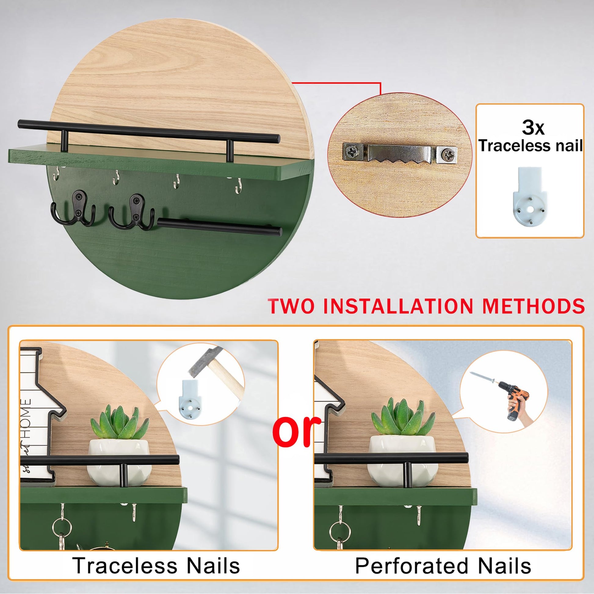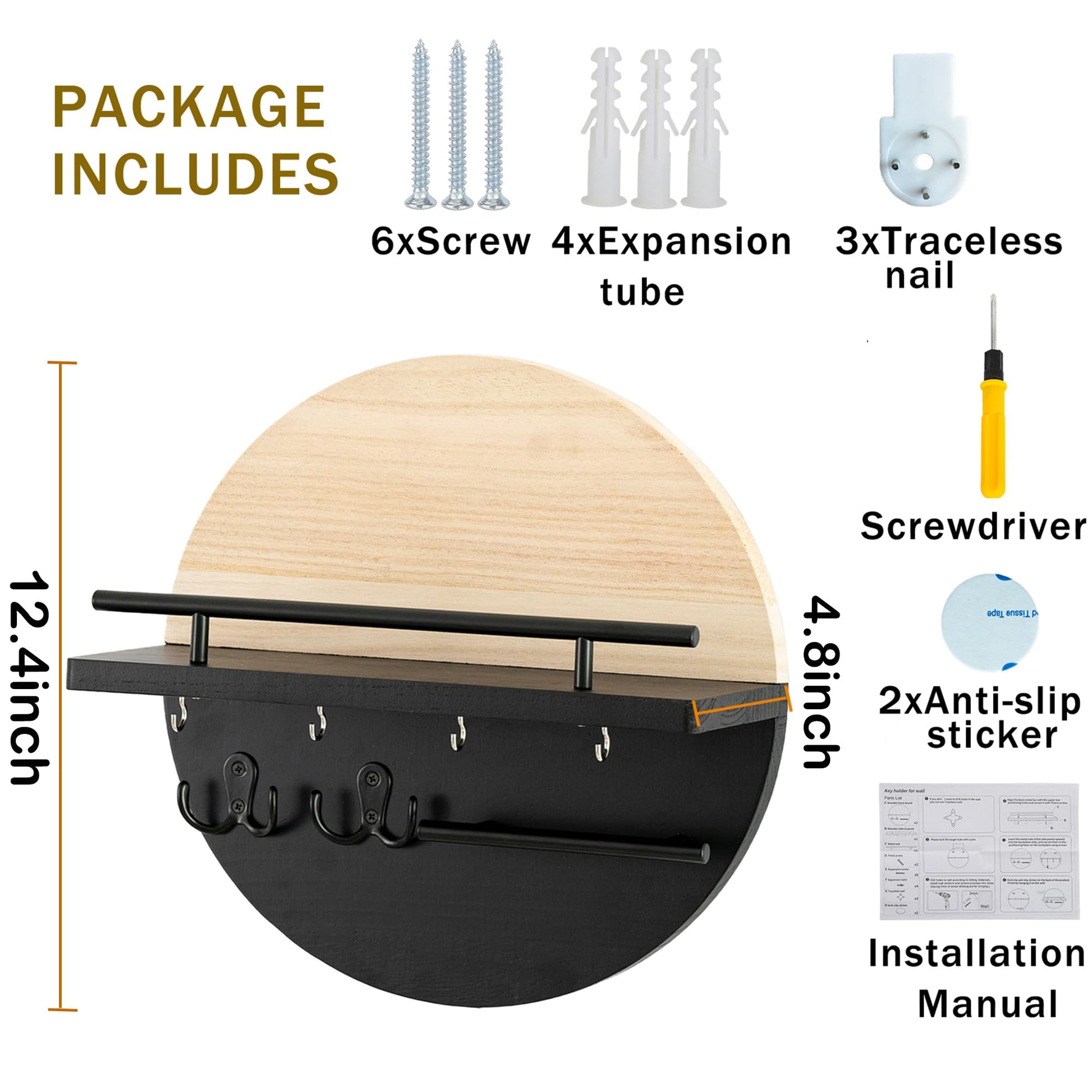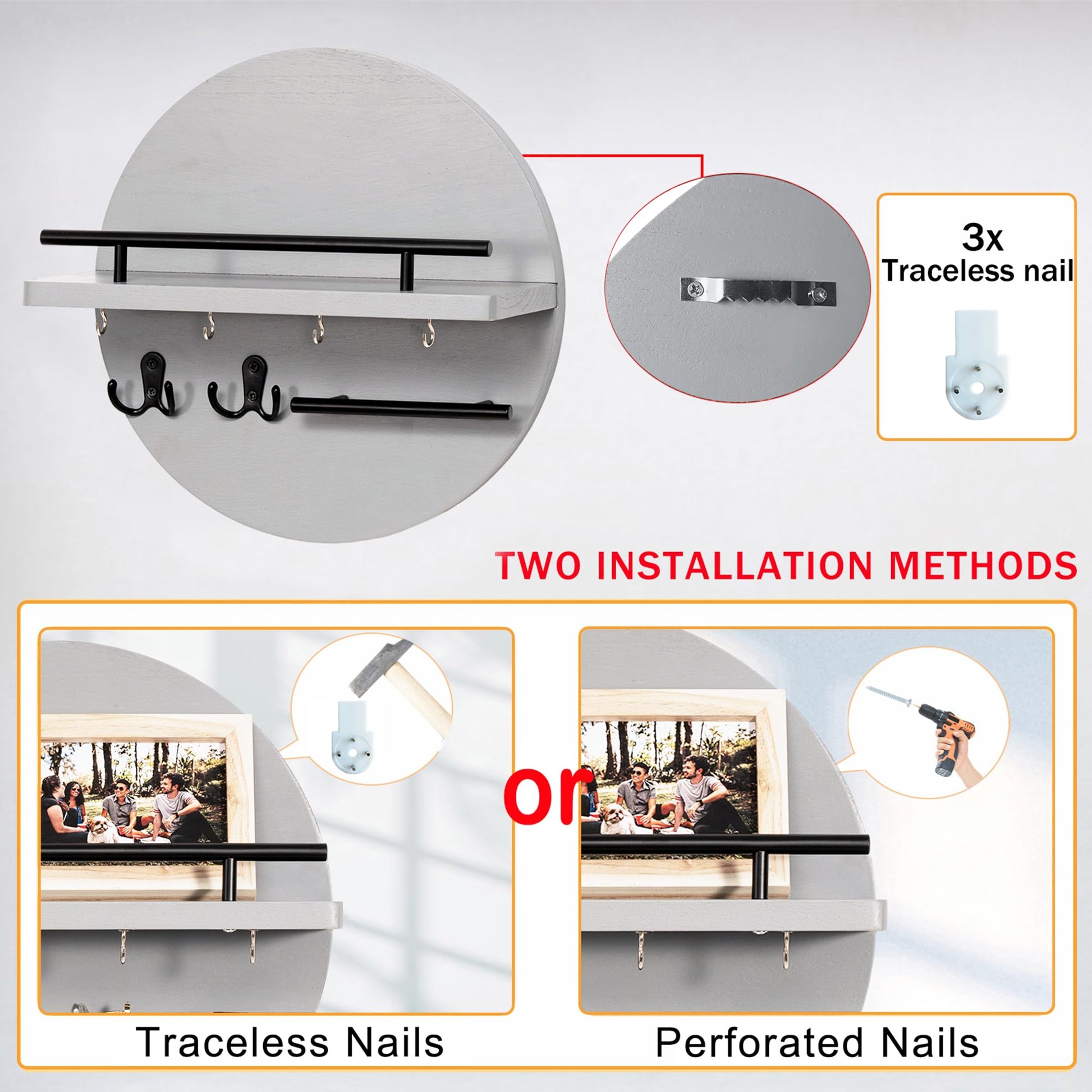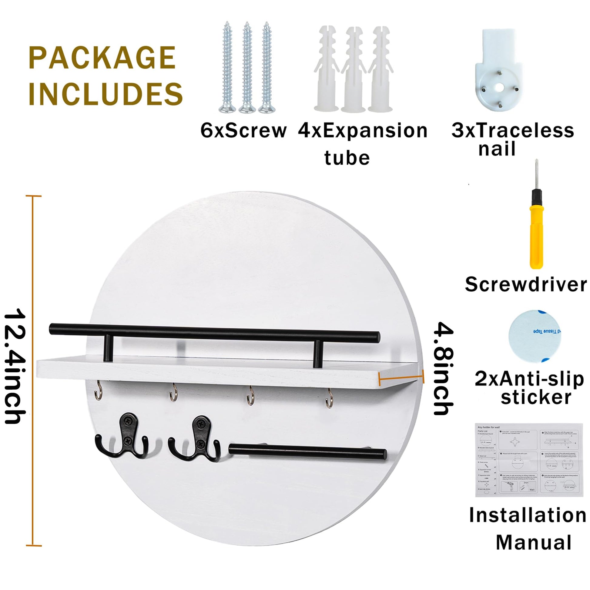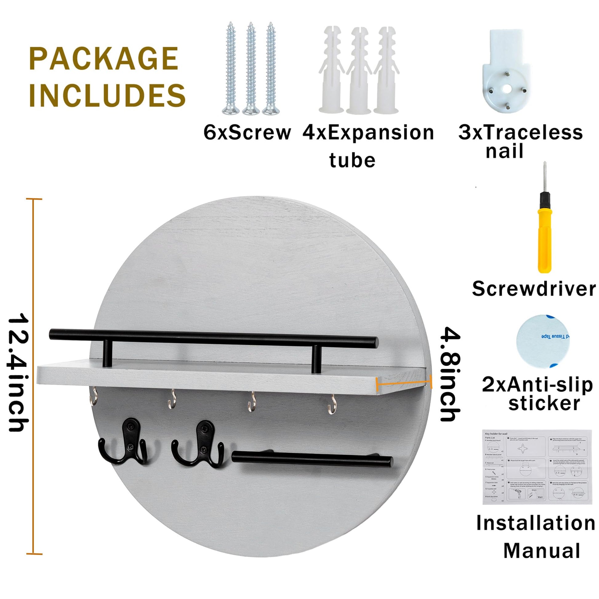 - EASY TO INSTALL KEY HANGER: The wall decorative key holder comes with drywall anchors, screws, traceless nails, screwdriver, instruction manual and other installation accessories. Everything comes pre-installed except for the small shelf and the metal Guardrail above it. If you don't want to drill holes in the wall, you can install it with traceless nails, which can support 20 pounds of weight