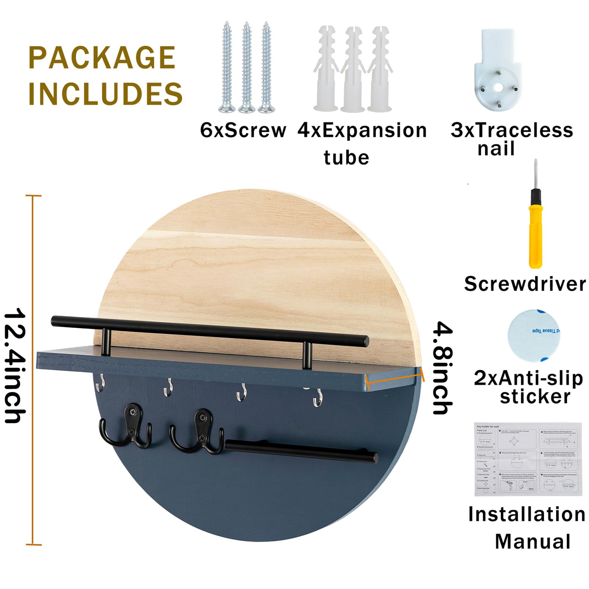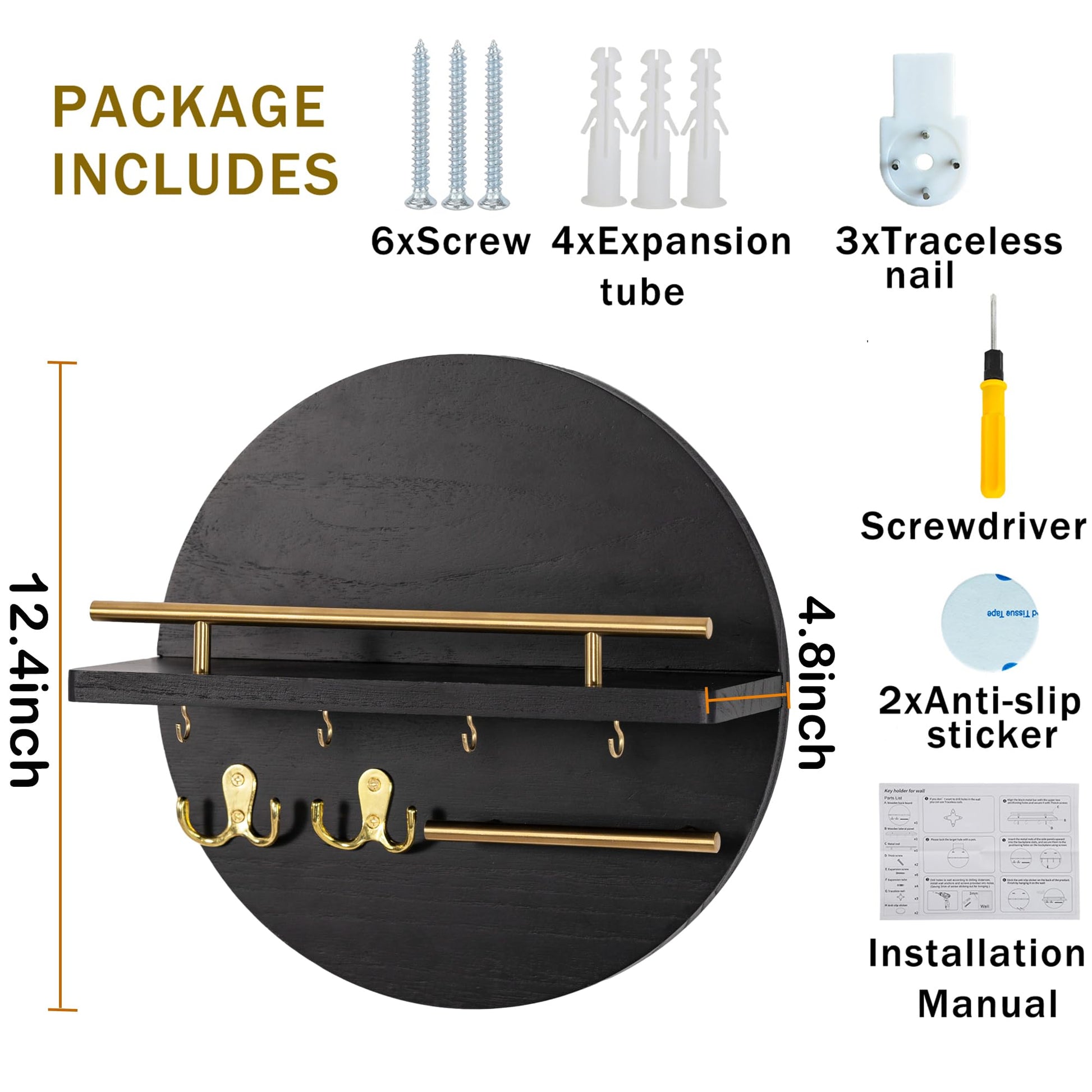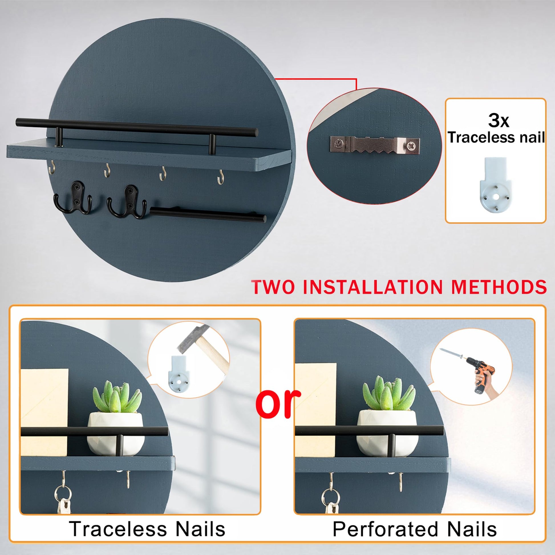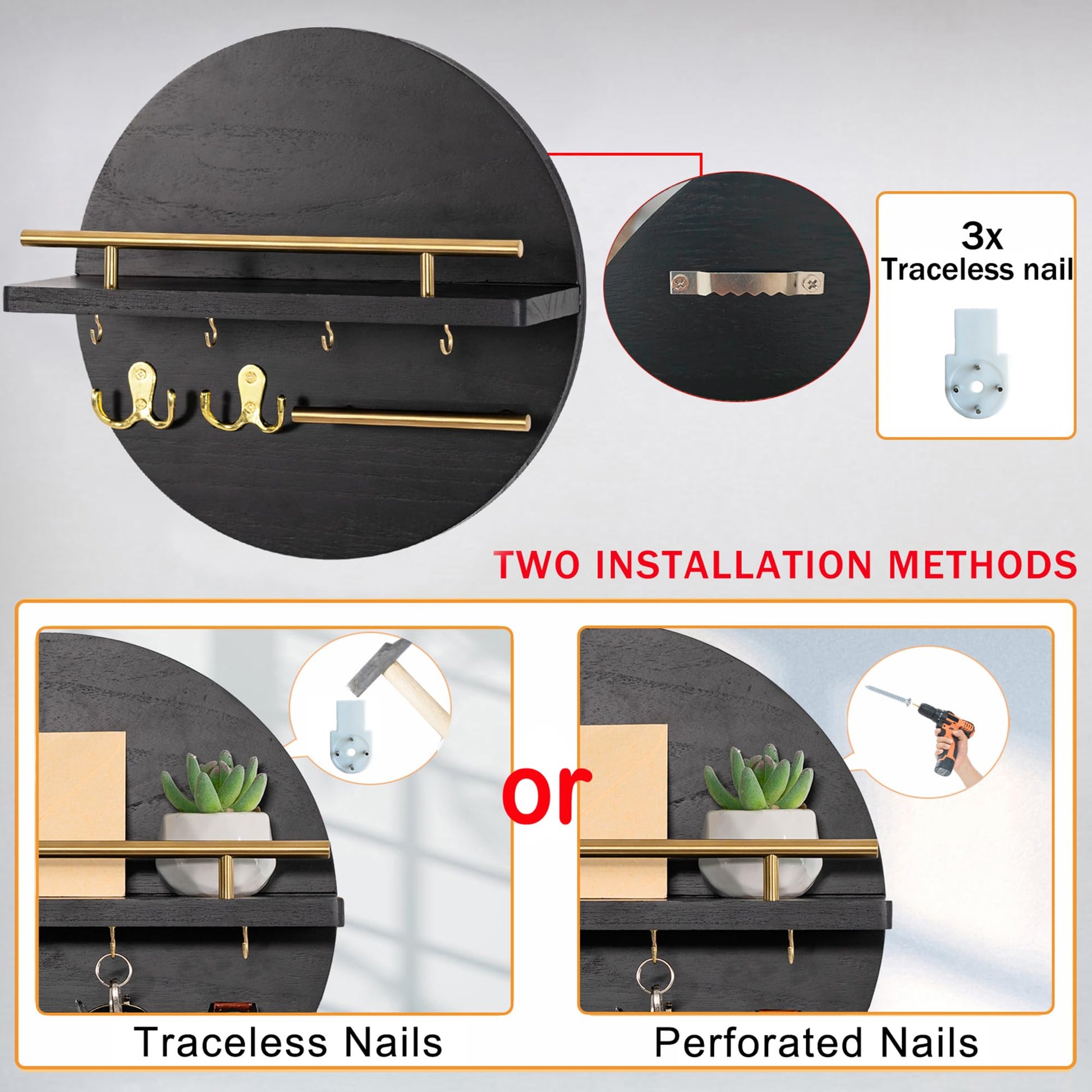 - EASY TO INSTALL KEY HANGER: The wall decorative key holder comes with drywall anchors, screws, traceless nails, screwdriver, instruction manual and other installation accessories. Everything comes pre-installed except for the small shelf and the metal Guardrail above it. If you don't want to drill holes in the wall, you can install it with traceless nails, which can support 20 pounds of weight