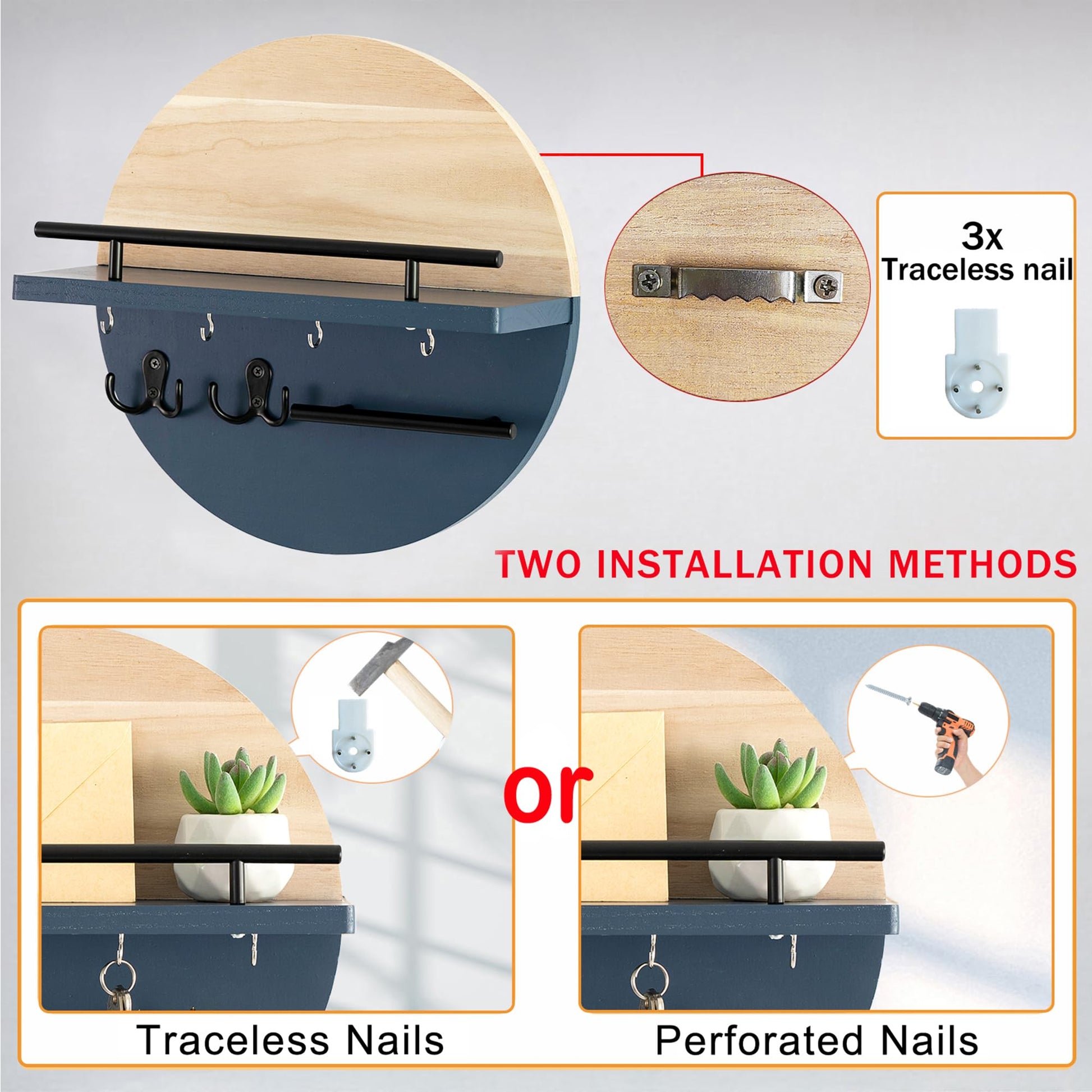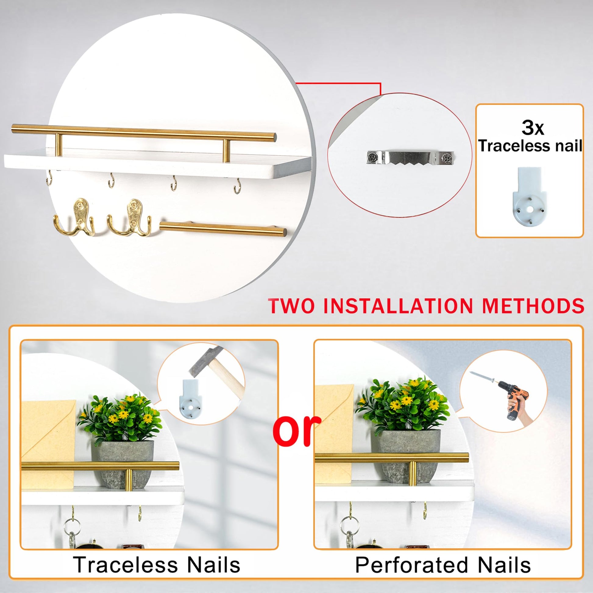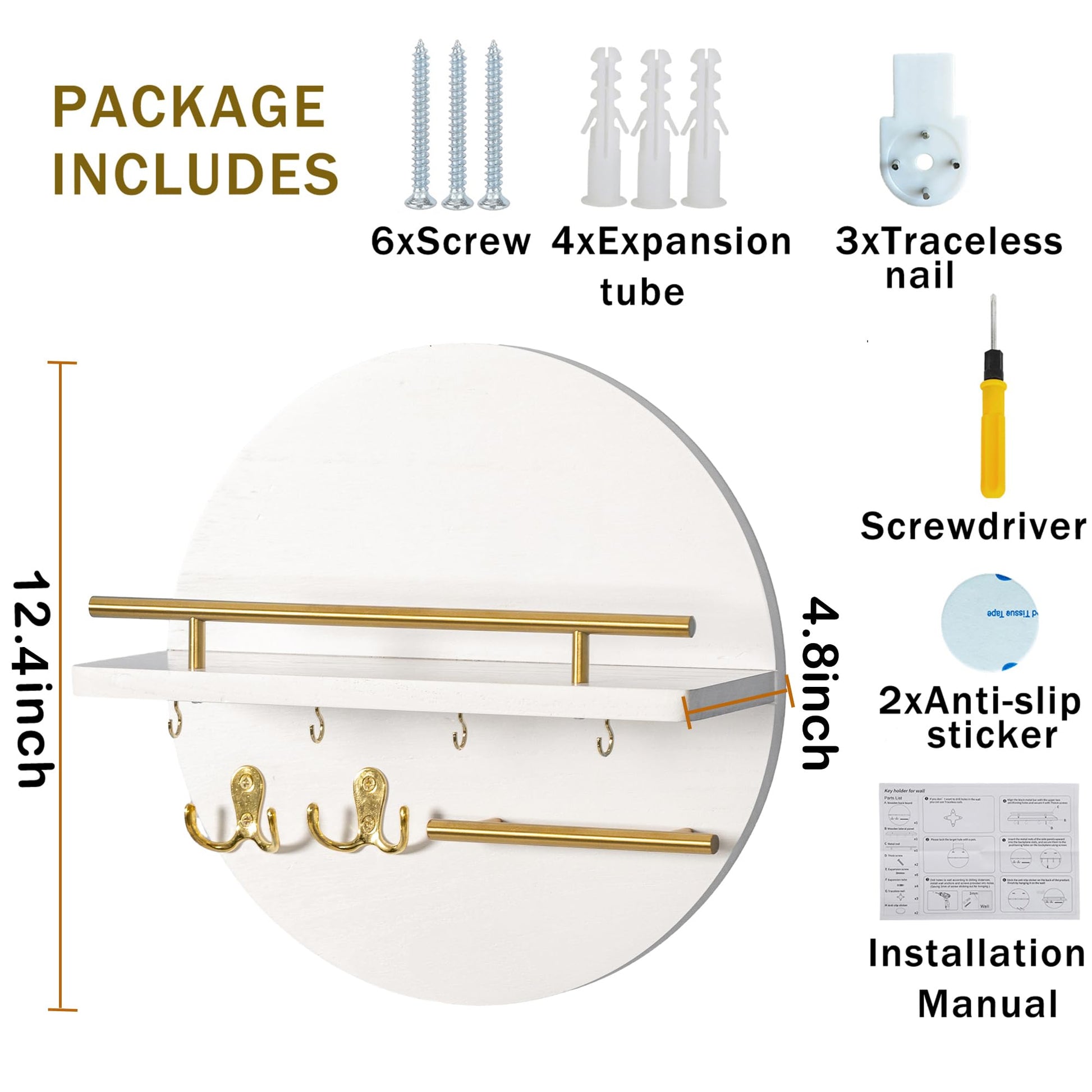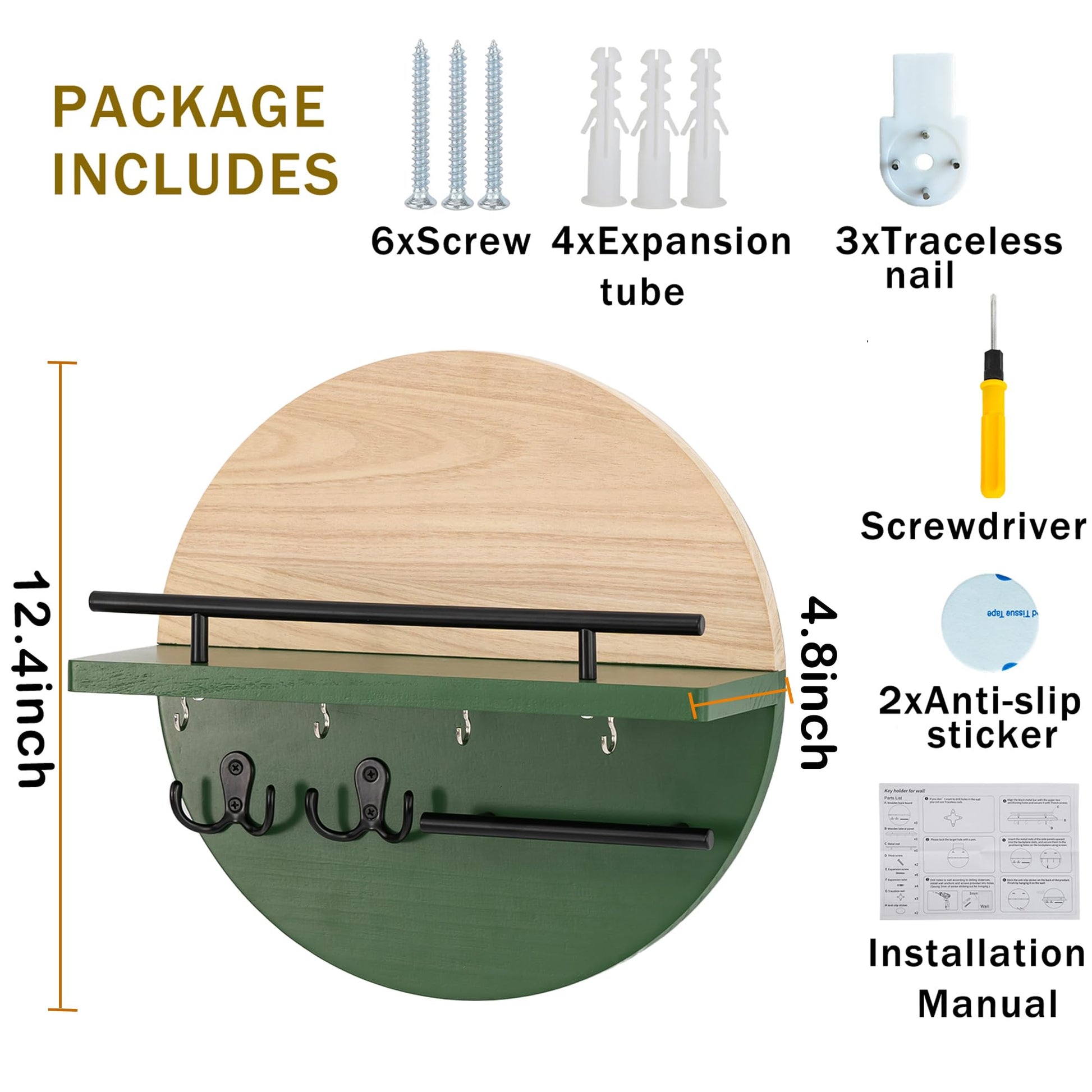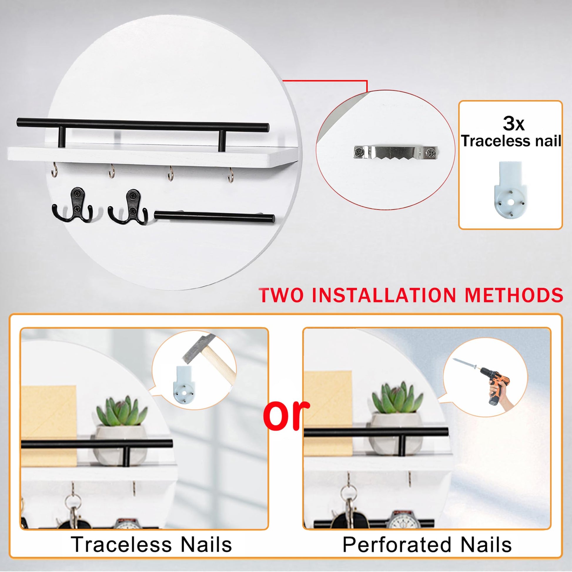 - EASY TO INSTALL KEY HANGER: The wall decorative key holder comes with drywall anchors, screws, traceless nails, screwdriver, instruction manual and other installation accessories. Everything comes pre-installed except for the small shelf and the metal Guardrail above it. If you don't want to drill holes in the wall, you can install it with traceless nails, which can support 20 pounds of weight