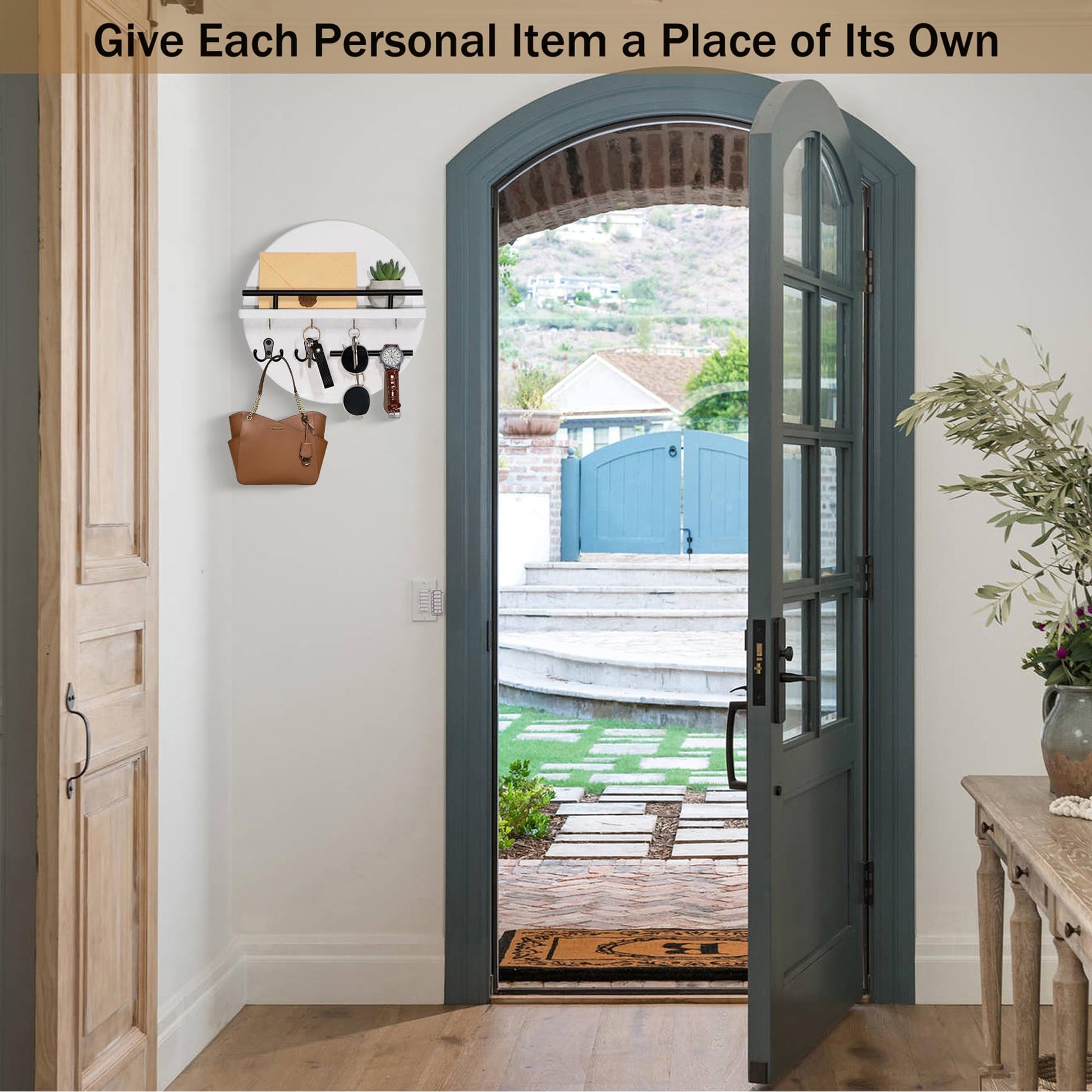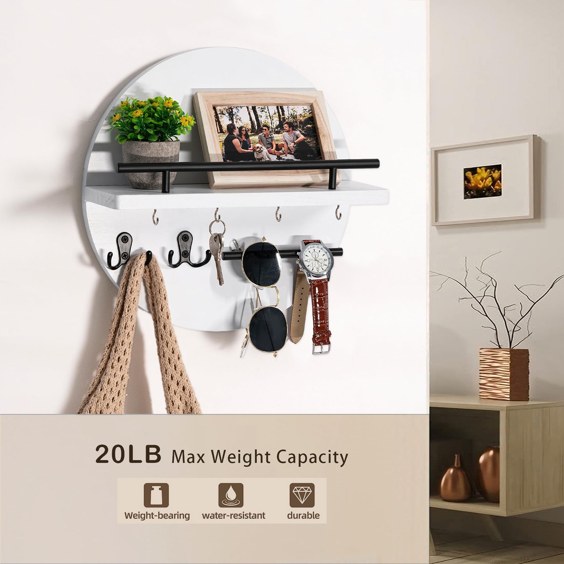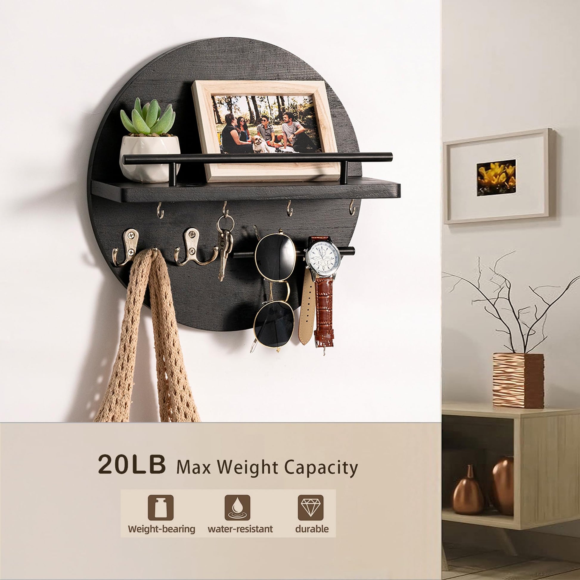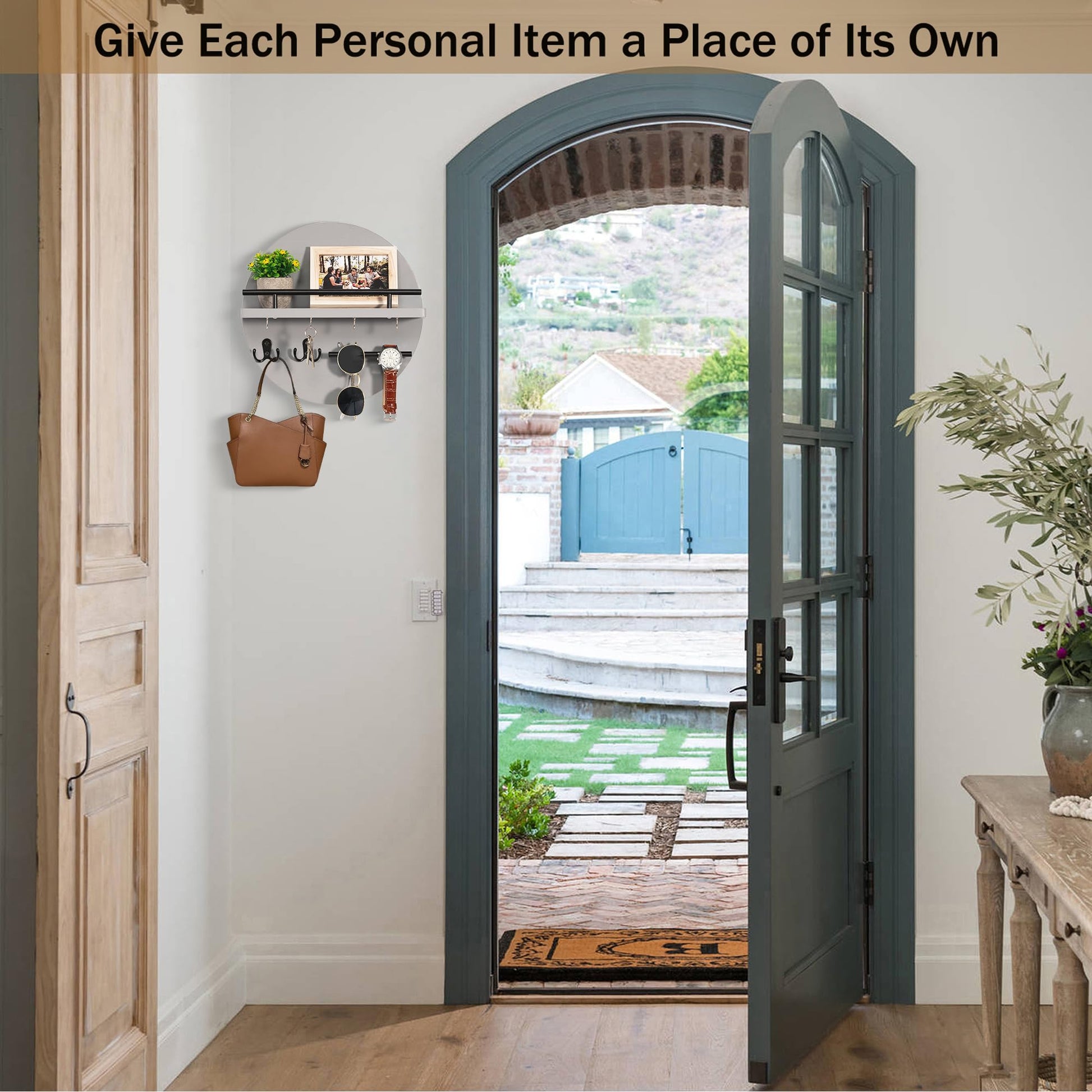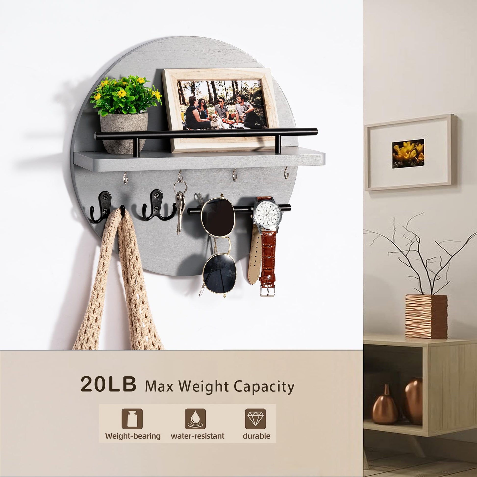 - VERSATILE STORAGE MAIL KEY HOLDER - Wall mounted key rack can aid you to make full use of wall space, avoiding confusion and loss. One small floating shelf to store your mails, bills, letters, magazines, wallets, accessories, small plants, Electronic equipment and more; 2 metal double hooks and 4 single hooks for hanging your keys, bags, umbrella, coat & hat, dog leash, and so on. There is also an area for placing sunglasses and Watch Jewelry in the lower-right corner