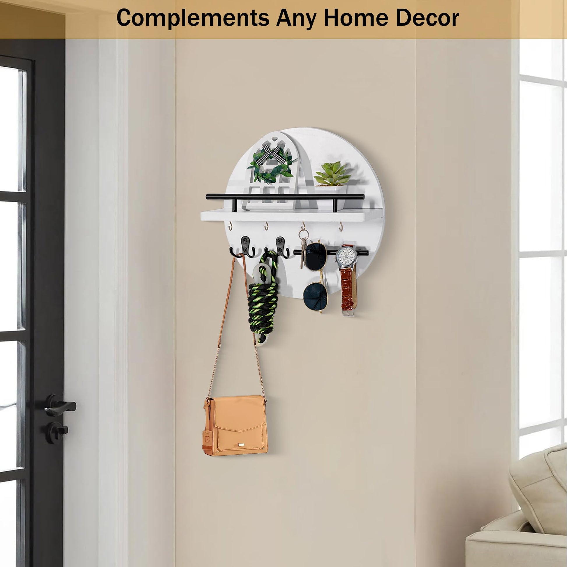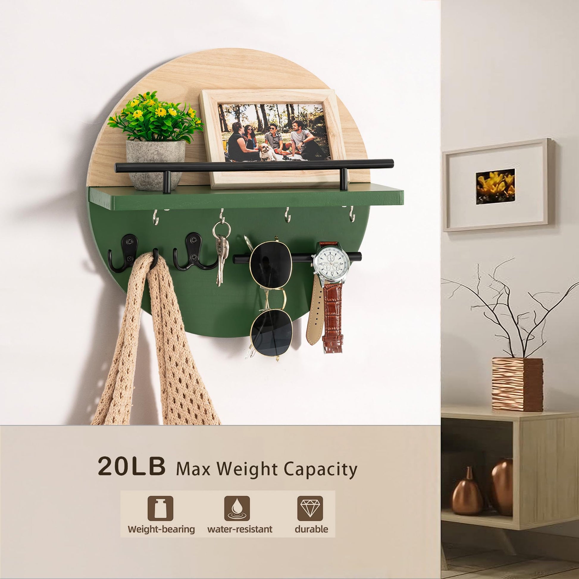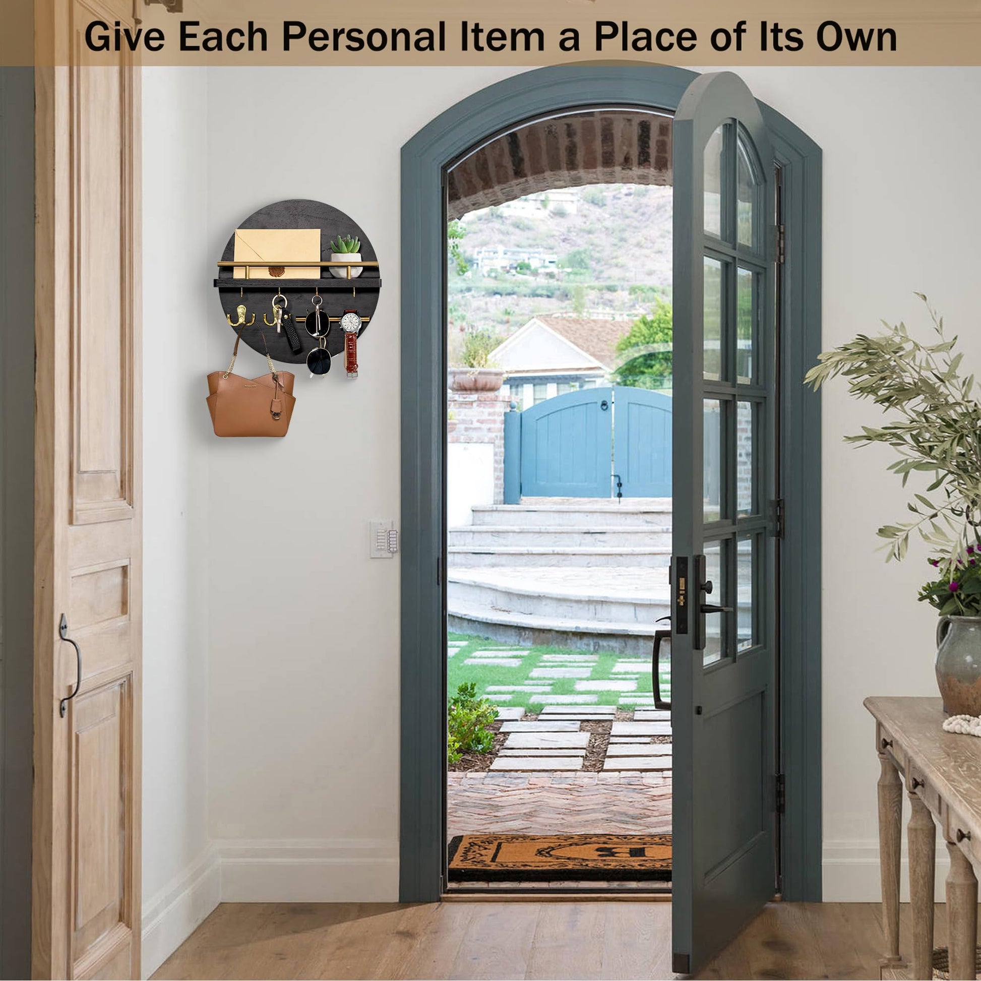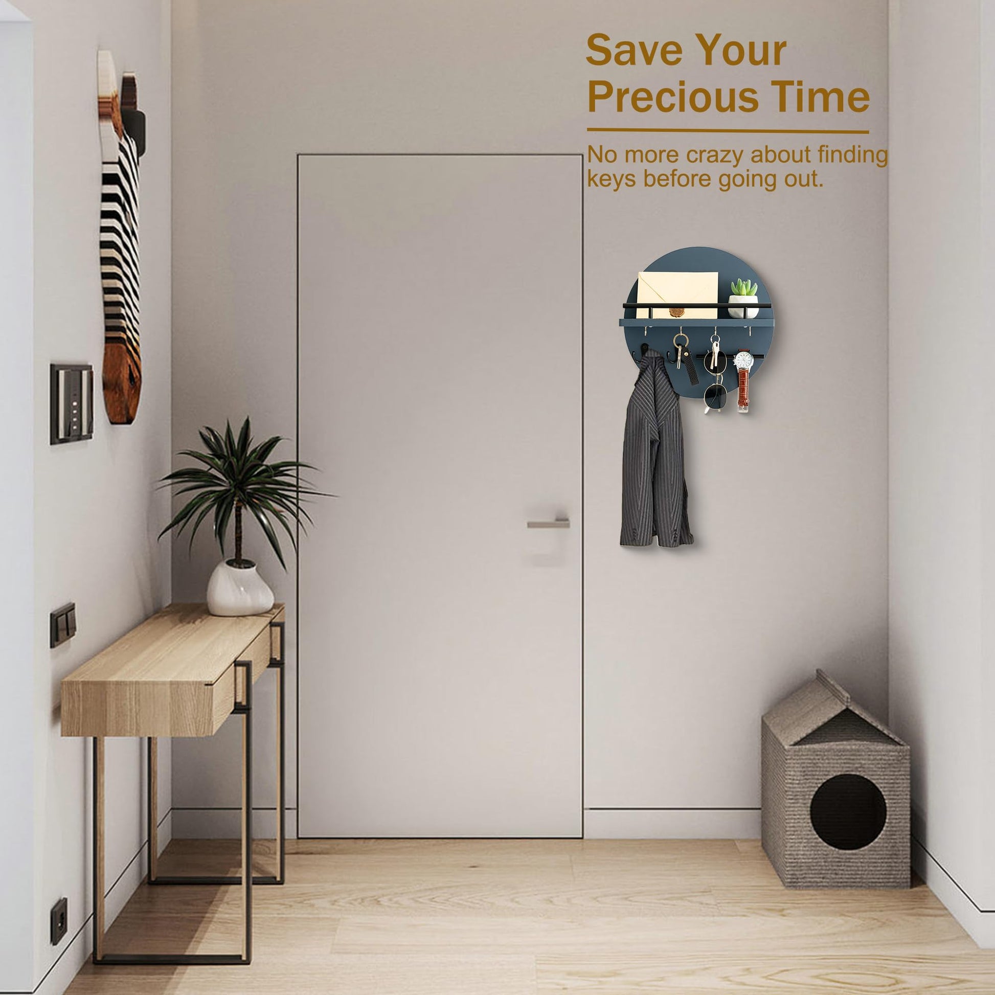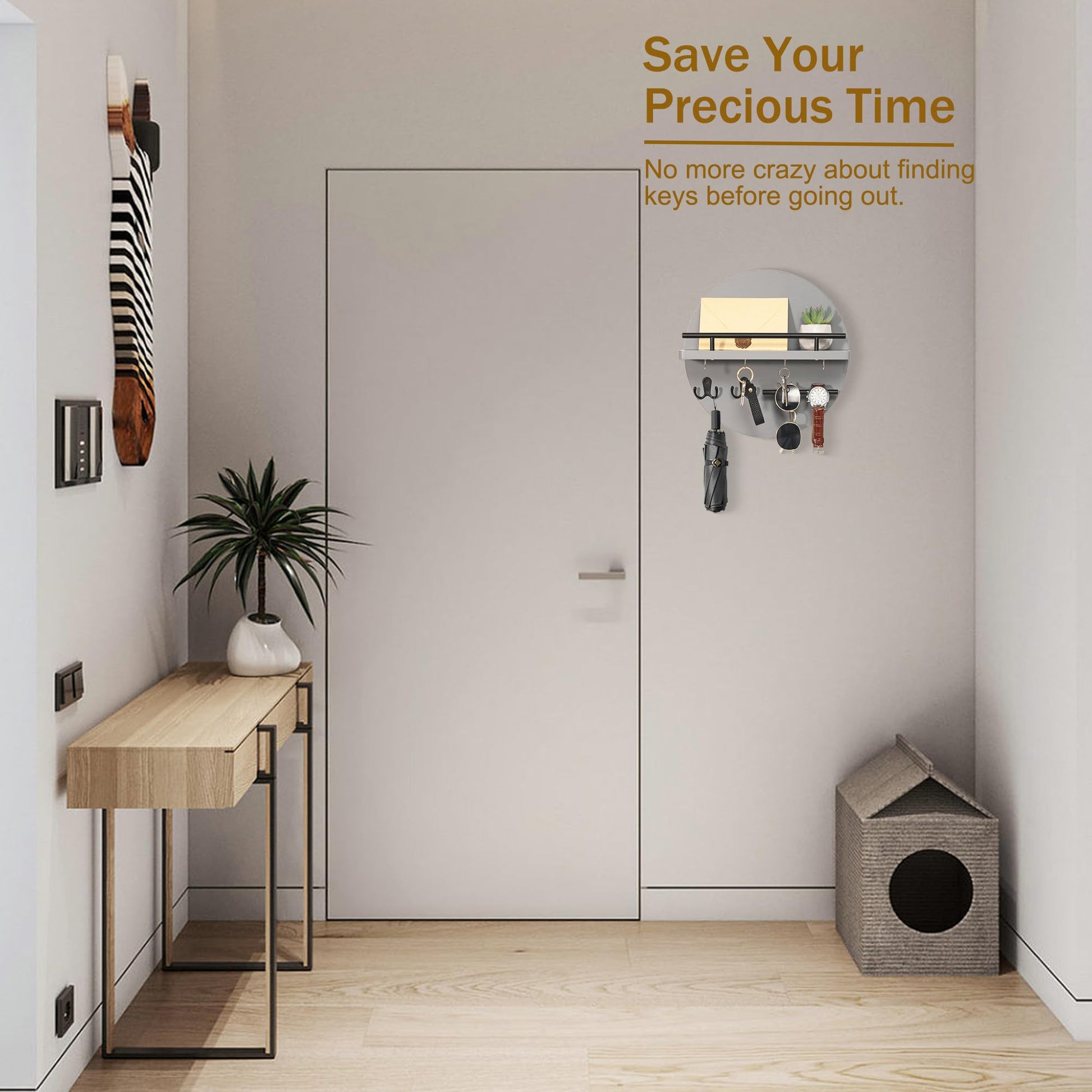 - VERSATILE STORAGE MAIL KEY HOLDER - Wall mounted key rack can aid you to make full use of wall space, avoiding confusion and loss. One small floating shelf to store your mails, bills, letters, magazines, wallets, accessories, small plants, Electronic equipment and more; 2 metal double hooks and 4 single hooks for hanging your keys, bags, umbrella, coat & hat, dog leash, and so on. There is also an area for placing sunglasses and Watch Jewelry in the lower-right corner