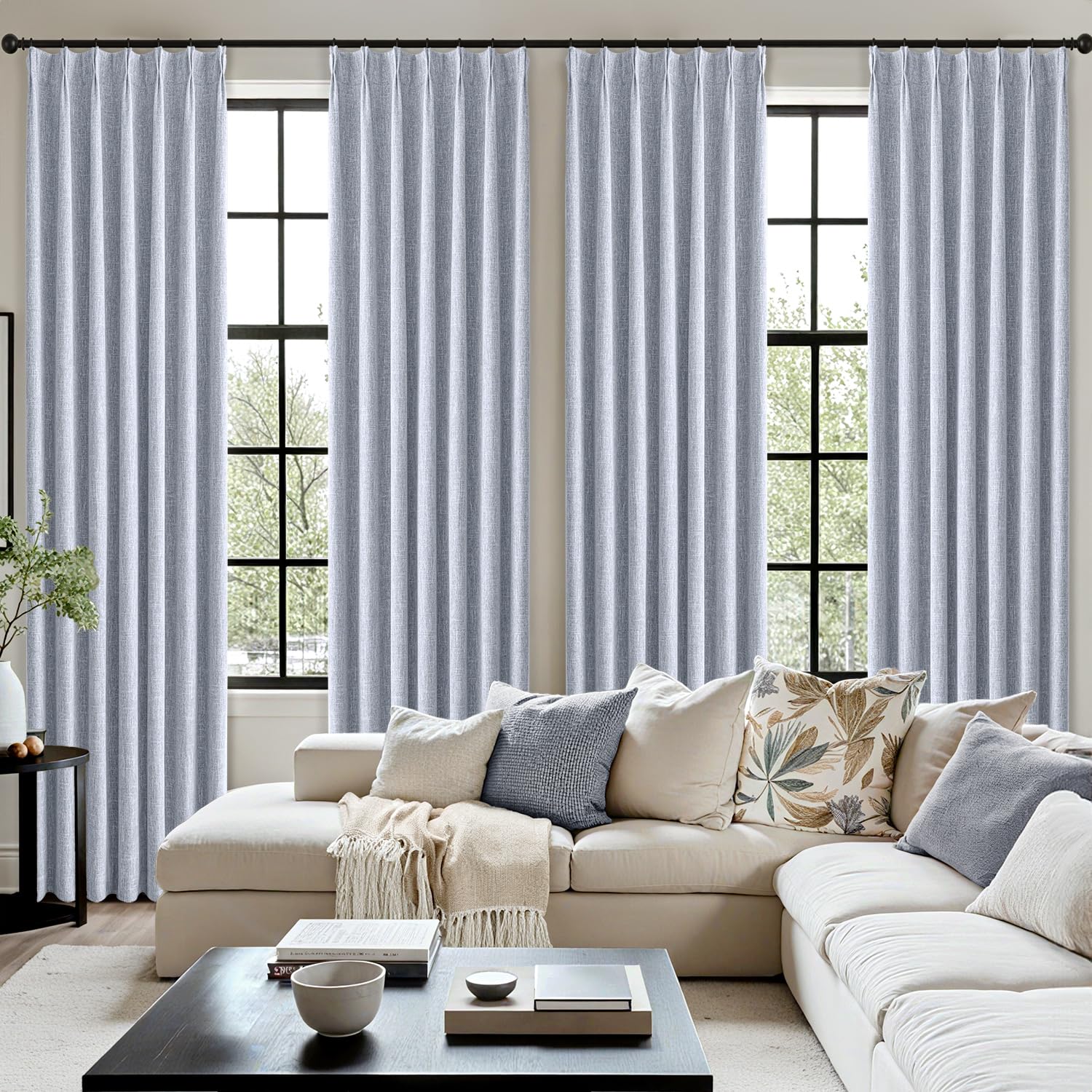 - Pinch Pleat Design & Memory Shape Training: Each curtain panel is designed with seven permanent pinch pleats and crafted with 1.6 times the fabric width, delivering an elegant draping effect with a refined three-dimensional look. This enhances the overall aesthetic and luxurious feel. Meticulously shaped with 248°F (120°C) steam for 60 minutes, the curtains maintain their original form and resist wrinkles, ensuring long-lasting beauty and a custom-made appearance
